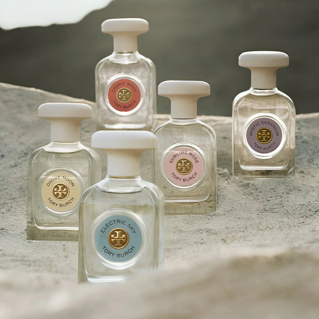 Experience Tory Burch Cosmic Wood Eau de Parfum: a magical blend of cardamom, jasmine, and vetiver, inspired by warmth, sophistication, and vibrant possibilities.