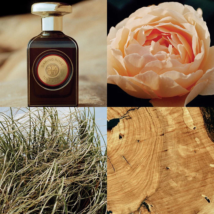 Daring Rose Eau de Parfum: A luxurious, alluring fragrance with rich red rose and velvety violet notes, inspired by Tory Burch's dreamscapes.