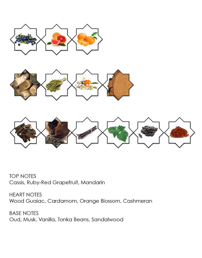 Invigorating top notes of cassis, ruby-red grapefruits, and mandarin, deliver a fresh and zesty introduction. Its heart reveals a woody embrace, featuring guaiac wood, cardamom, orange blossom, and cashmeran, combining depth and elegance. The base notes reveal a symphony of oud, musk, patchouli, sandalwood, tonka beans, and vanilla, creating a lasting and alluring impression.